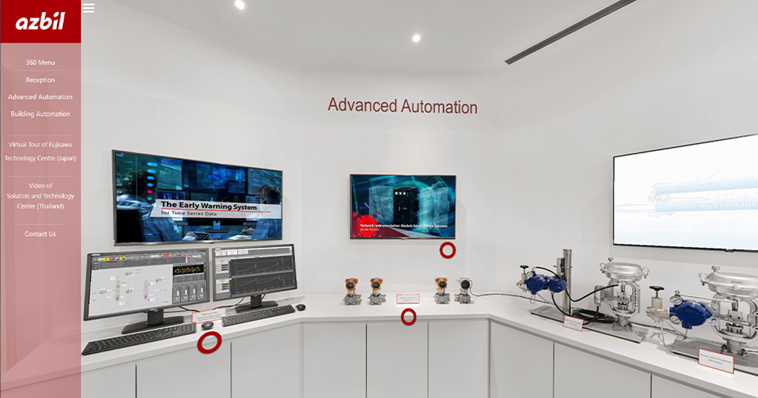 Virtual tour of the Azbil Singapore showroom, showcasing their automation products and solutions. The showroom virtual tour allows visitors to explore the space remotely and interact with the product displays.