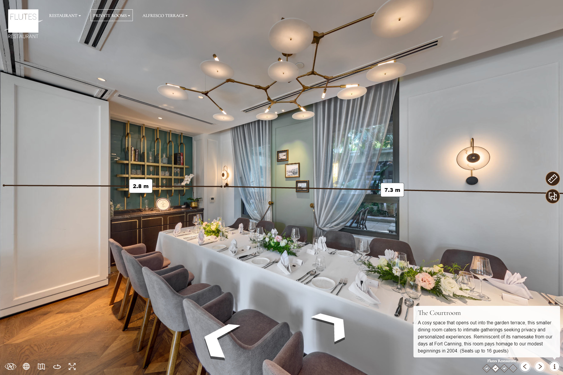 To start your virtual tour of Flutes Restaurant, click on the image above or the button below. Each section of the tour offers a unique perspective, allowing you to fully experience the charm and elegance of this wonderful venue.