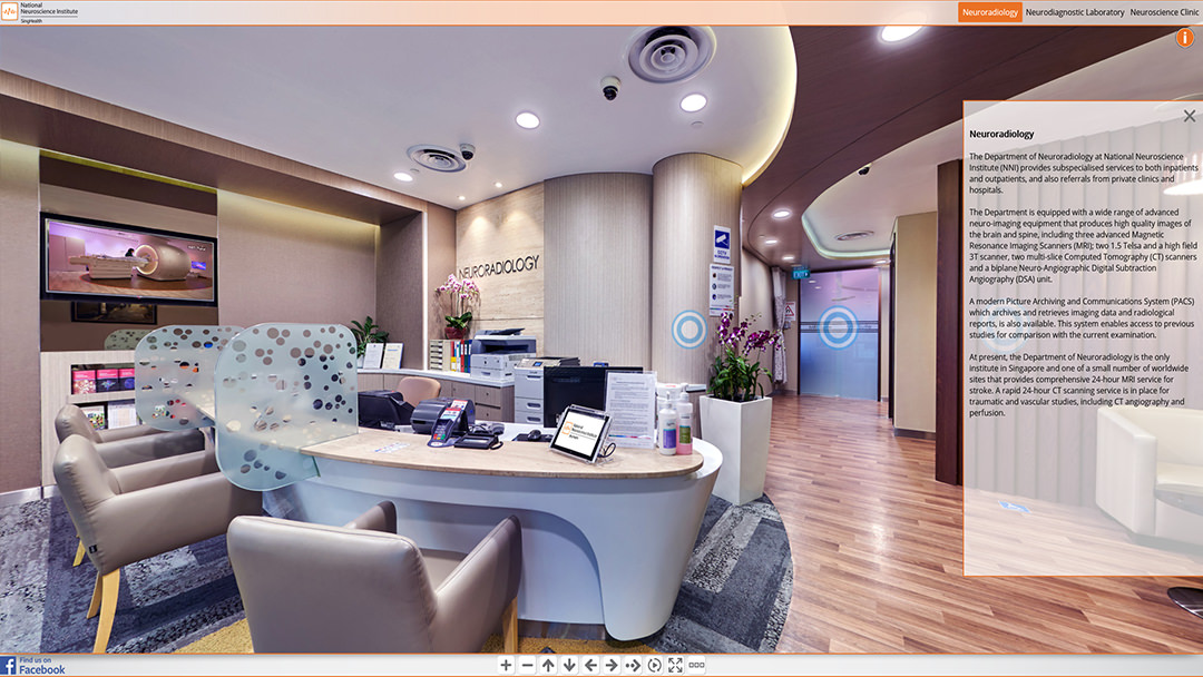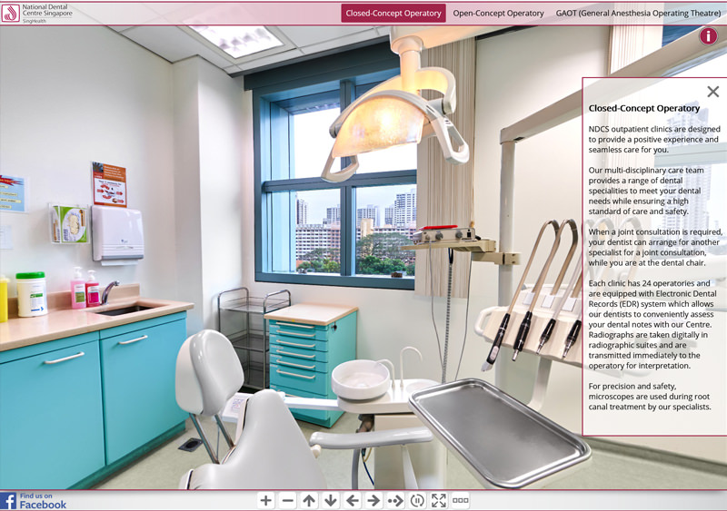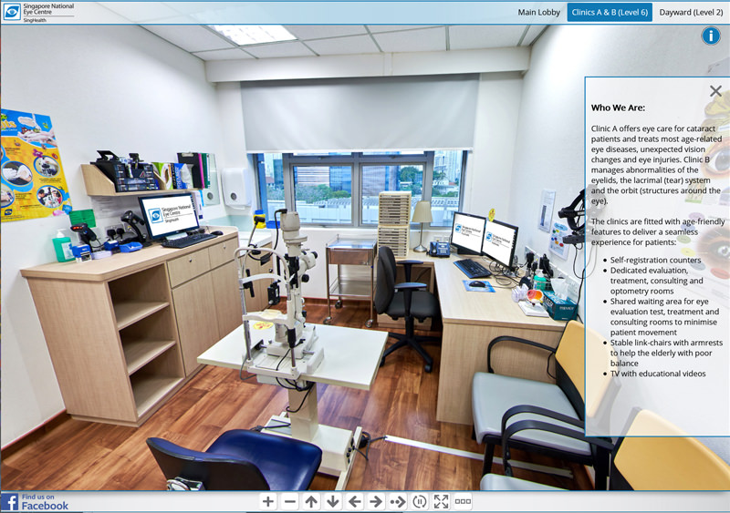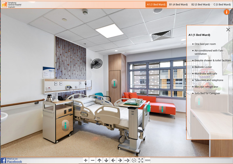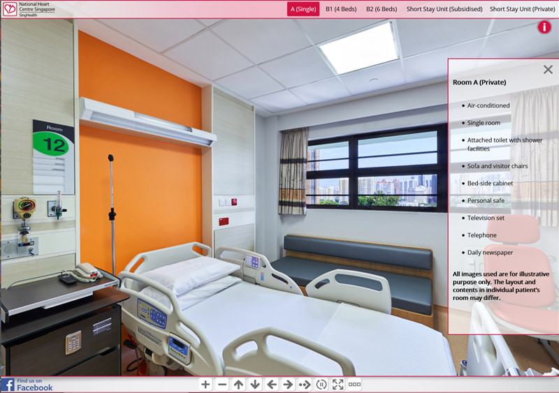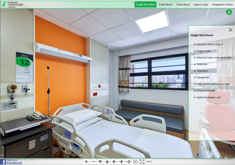 Since 2016 we have been involved in creating hospital virtual tours for SingHealth locations in Singapore.The project started with a virtual tour of KK Women’s and Children’s Hospital and developed the web interface. Since then we have photographed virtual tours for 8 other SingHealth locations including Bright Vision Hospital, National Dental Centre, National Heart Centre, National Neurological Institute, Singapore General Hospital, Sengkang Community Hospital, Sengkang General Hospital and the The original virtual tour interface has now been updated and custom coded. It includes a top navigation menu system with groups for each ward and a side description box which provides various information about the 360 photo. This can be opened or closed by the x within the description box or with the info button above it. There is a bottom navigation bar which allows the viewer to zoom in and out, turn left and right, stop the auto rotation of the tour or make the tour full screen. You can also find a “find us on facebook” link which will take you to to the Facebook page of the current hospital.